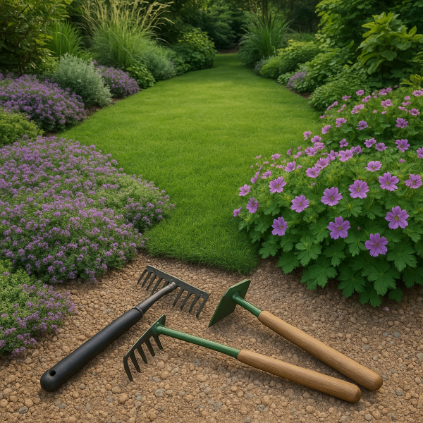 Un désherbeur thermique, une binette et un rùteau à gravier sont essentiels pour maintenir un jardin propre.