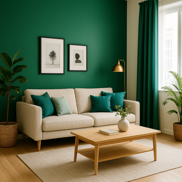 - Peinture murale : Peindre un mur en émeraude dans un salon peut servir de point focal. Associez-le à des meubles en bois clair pour un équilibre parfait.